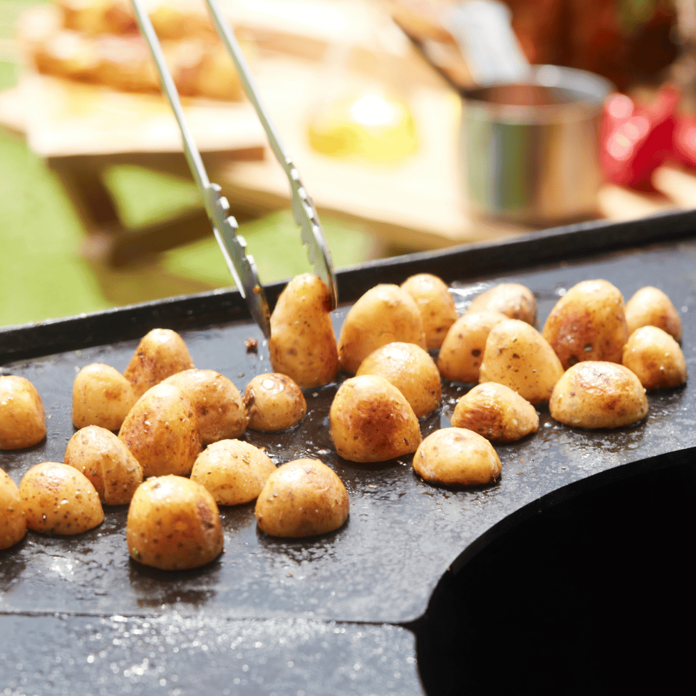 Thanks to the raised rim, there are no grease drops on the terrace and ingredients cannot fall off the cooking plate.