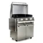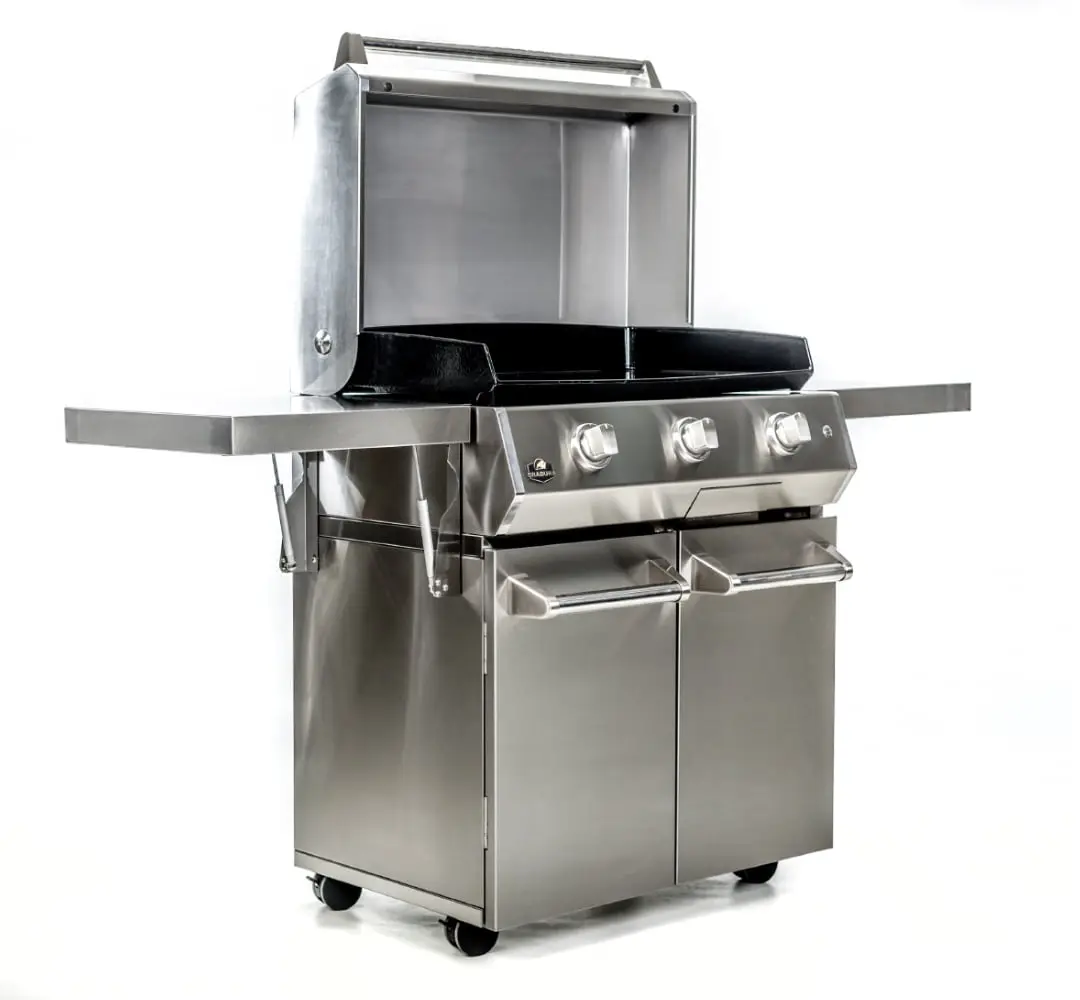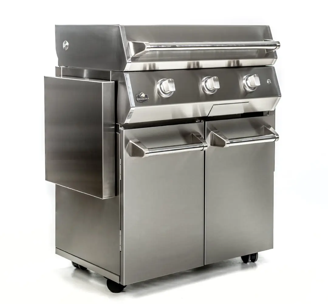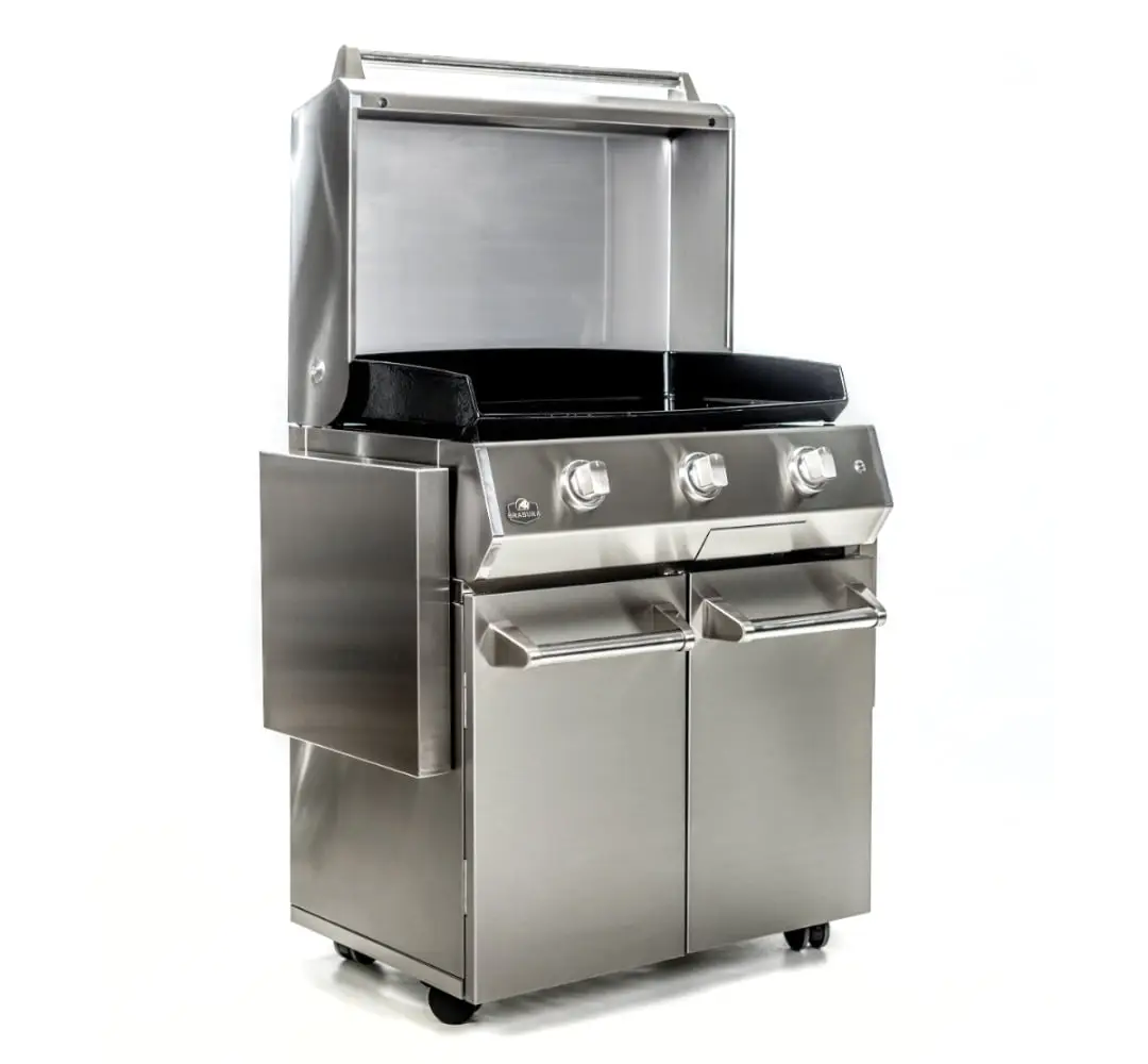 Two built-in side shelves for additional workspace. One access with double door to large storage capacity. 4 swivel castors with safety brakes and magnetic locks to enhance your outdoor cooking experience.