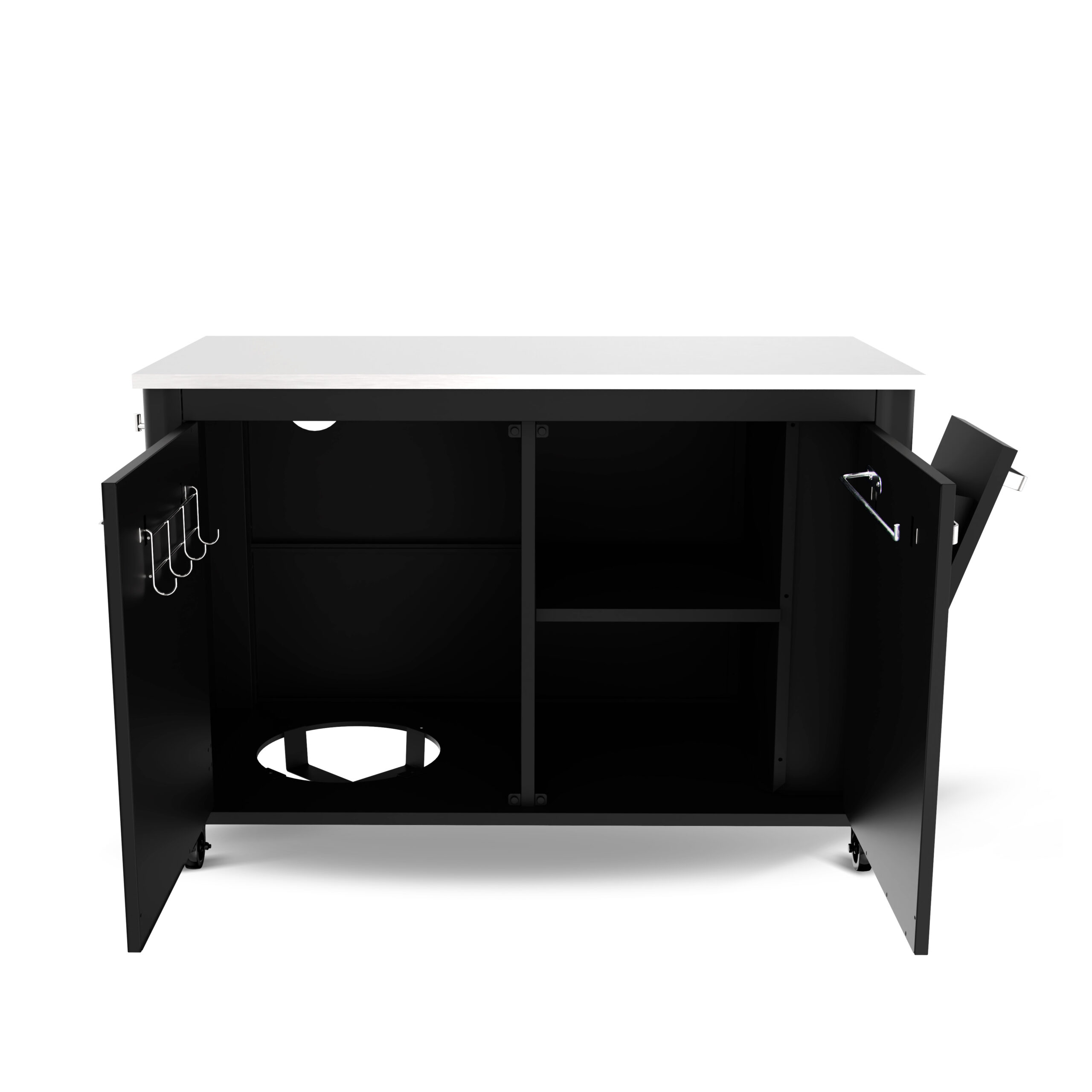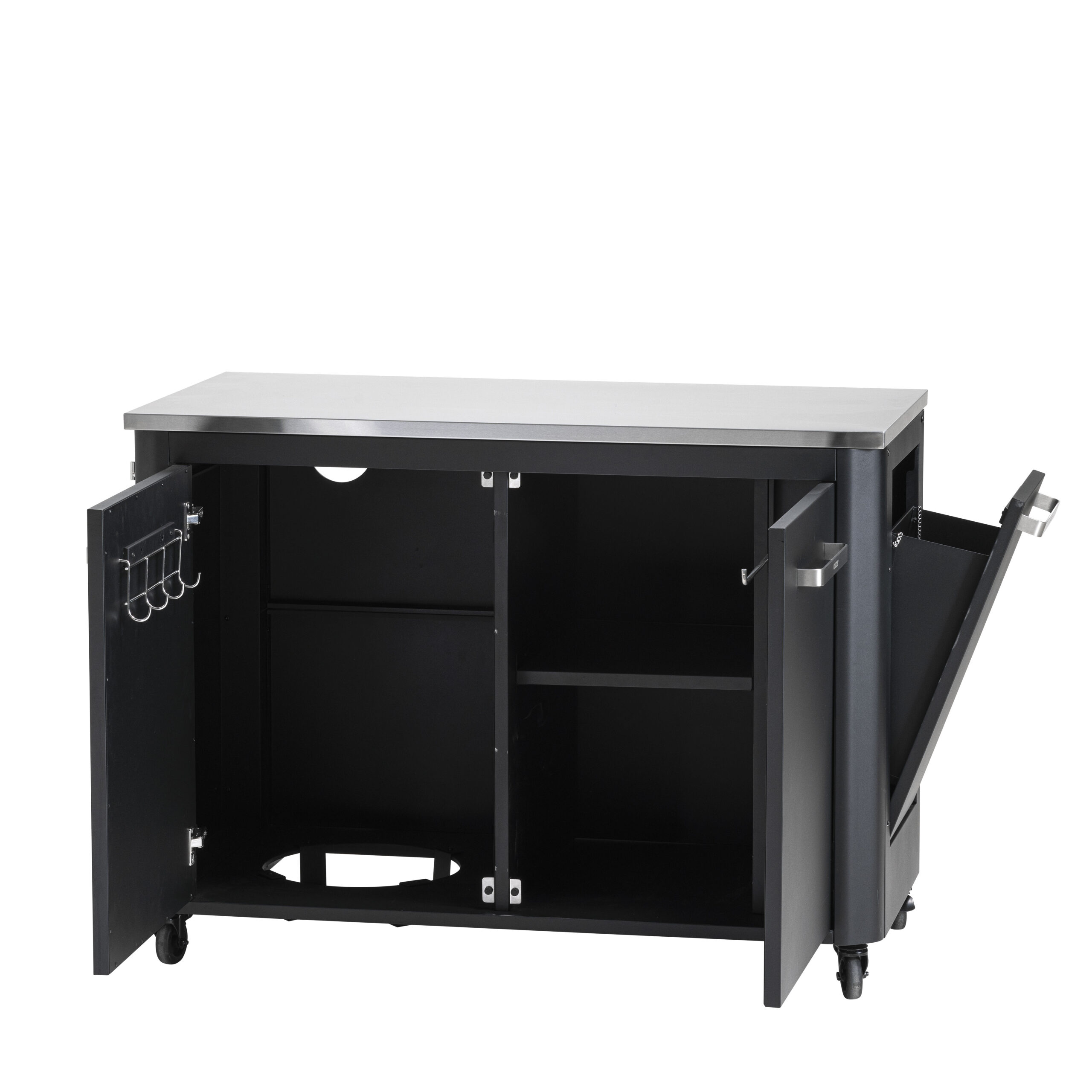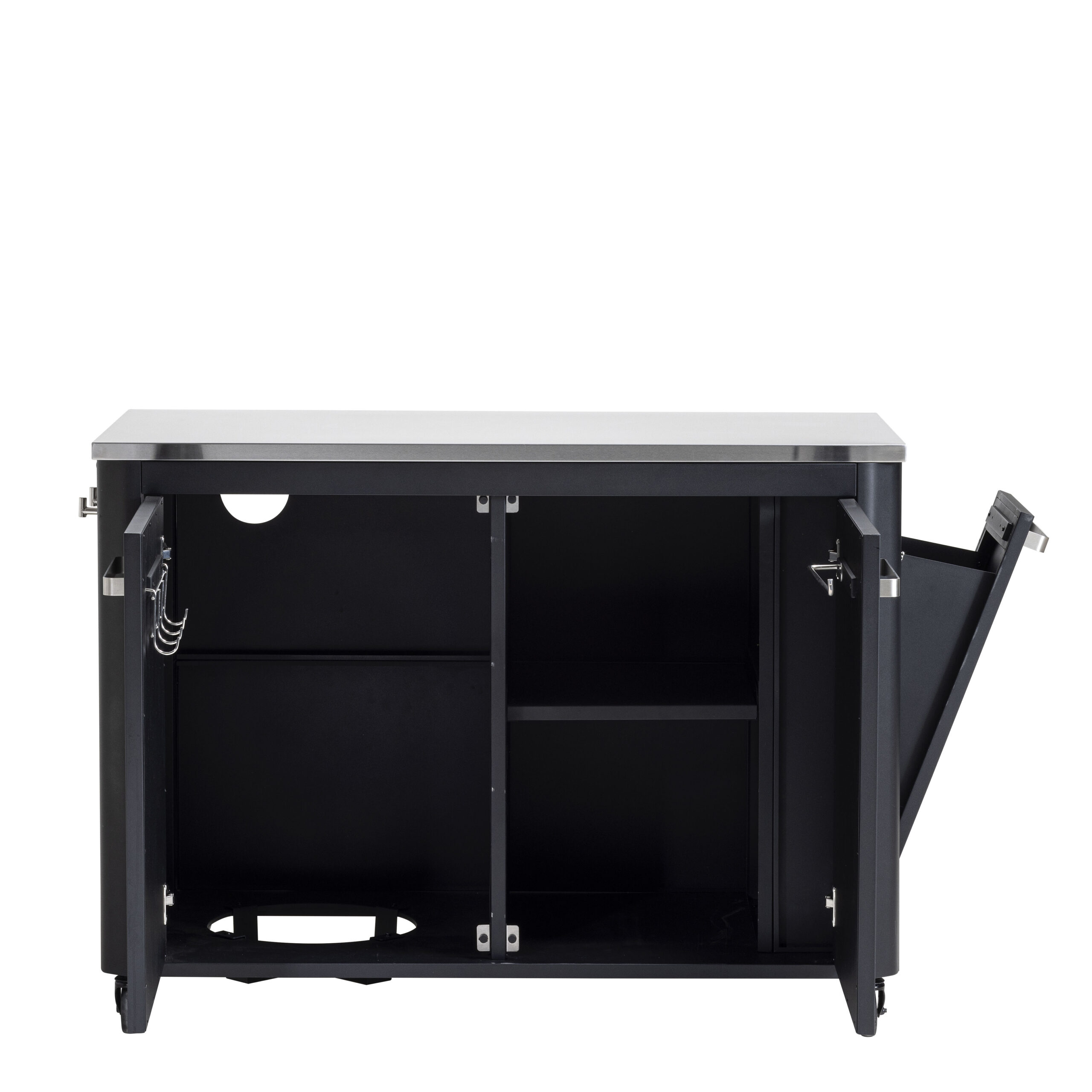 Includes: 2 doors, 7 hooks, 1 tea towel hook. built in garbage bin and inside gas bottle storage