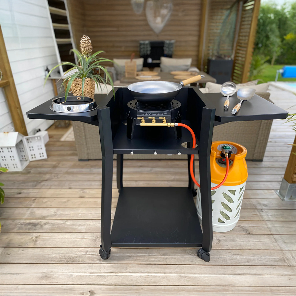 Elevate your culinary adventures with the HOT WOK Comfort Table. This innovative table is meticulously crafted to be the perfect companion for your HOT WOK, whether you own the HOT WOK Original 7 kW, HOT WOK Pro 12 kW, or HOT WOK Silver Line 4.5 kW. The Comfort Table is equipped with three high sides, providing excellent wind protection for your outdoor cooking sessions. This thoughtful design ensures a more enjoyable cooking experience when you’re preparing delicious meals in the great outdoors. Flexible Side Tables for Added Convenience Designed with practicality in mind, the Comfort Table comes with two foldable side tables. These side tables offer extra workspace, allowing you to keep ingredients and utensils within easy reach while you cook.