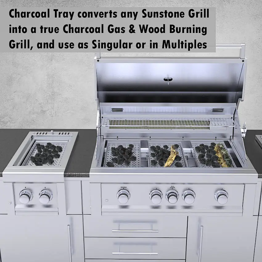 304 Stainless Steel Charcoal Tray for BBQ Grills features Triple Layered Construction allowing you to burn Charcoal/Smoke & Wood Logs within this convertible burn tray. Place the CHARCOAL Tray below the cooking grates on any of our Sunstone & Ruby Gas grill Models and adaptable to other gas grills in the market. Convert your gas grill into a gas charcoal hybrid with superior versatility. Lift top panel up and fill the channels with Mesquite Charcoal and Wood Chips or Water for added flavorful smoking experience. The sturdy material and three component construction ensures it will not warp in high heat usage.