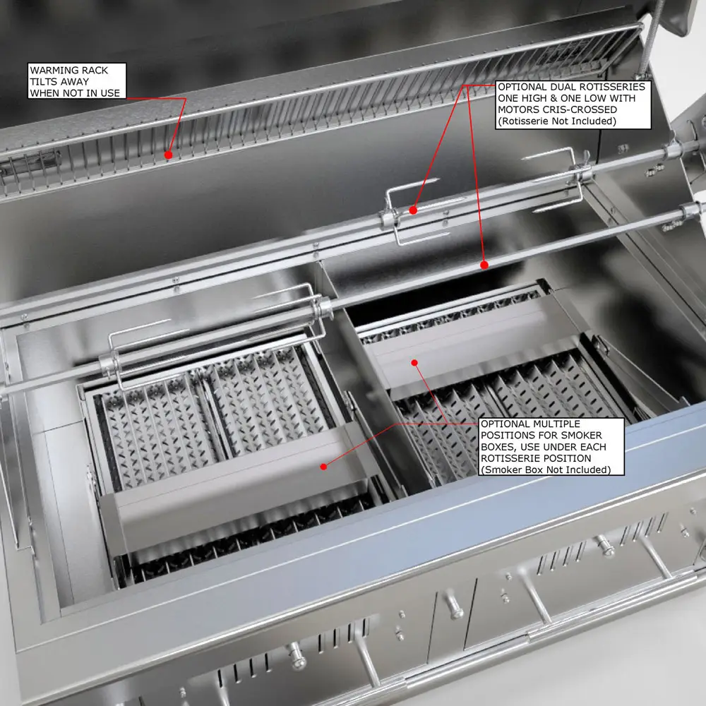 Details to highlight about the Sunstone hybrid charcoal & wood barbecue is that, for example, the 304 grade Stainless Steel structure is fully welded for greater strength and durability, unlike other brands on the market that are spot welded. The lid is built with a double layer of insulation with polished details that give it a modern and elegant look, making it perfectly integrated into any outdoor space. Two robust Stainless Steel burners with a power of 10.3 kW, will be in charge of igniting the fuel inside the 14-gauge 304 Stainless Steel charcoal and firewood drawer, including 10mm diameter solid stainless steel cooking grates, stainless steel heat diffusers all designed in such a way that will practically prevent all flare-ups when cooking. Stainless Steel flame directors create temperature zones that will help you achieve truly professional results .