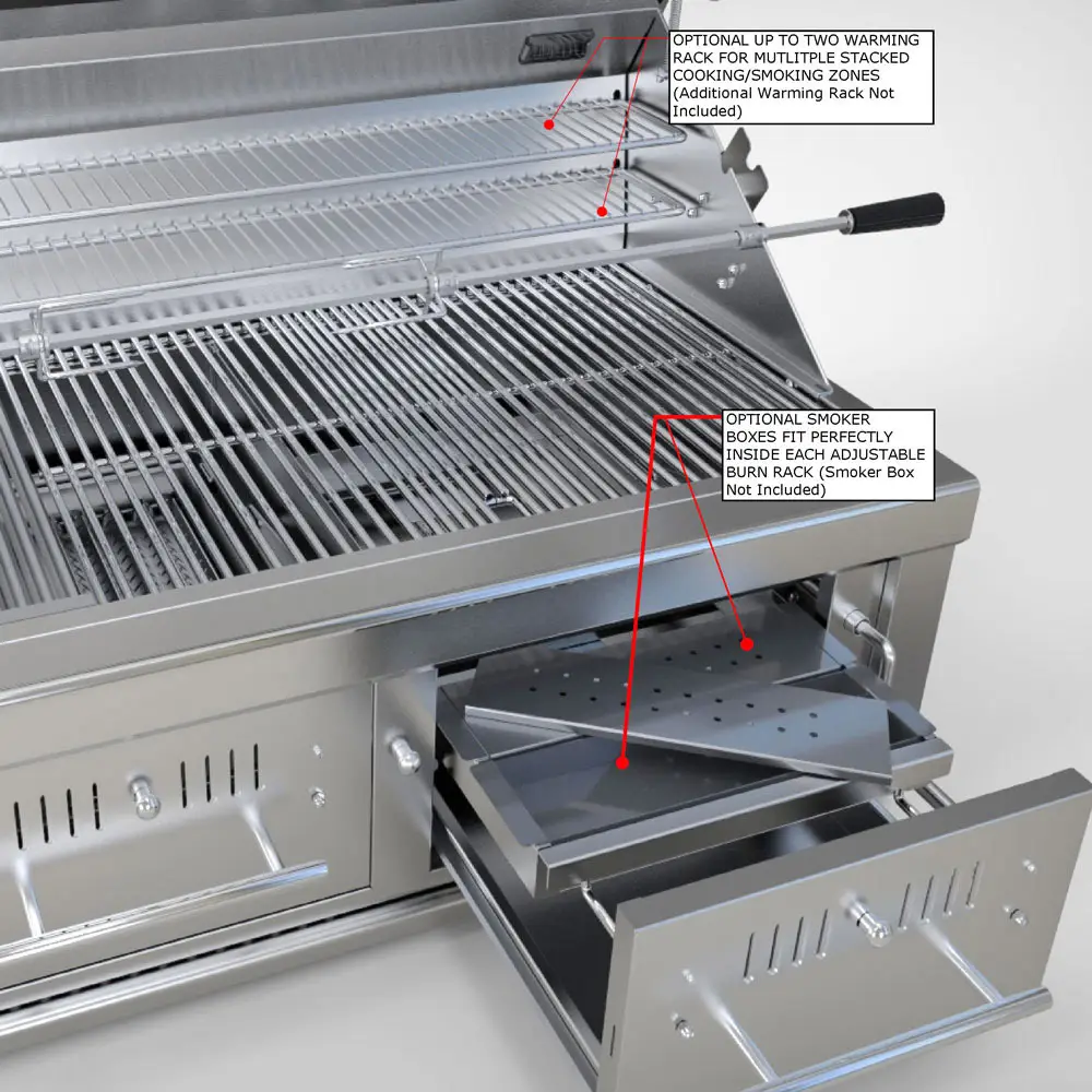 - 2 Trays for charcoal and firewood in each drawer and are height adjustable.