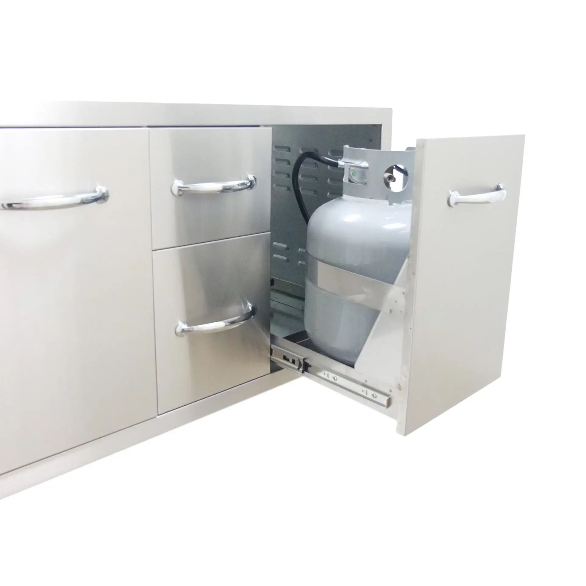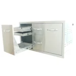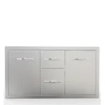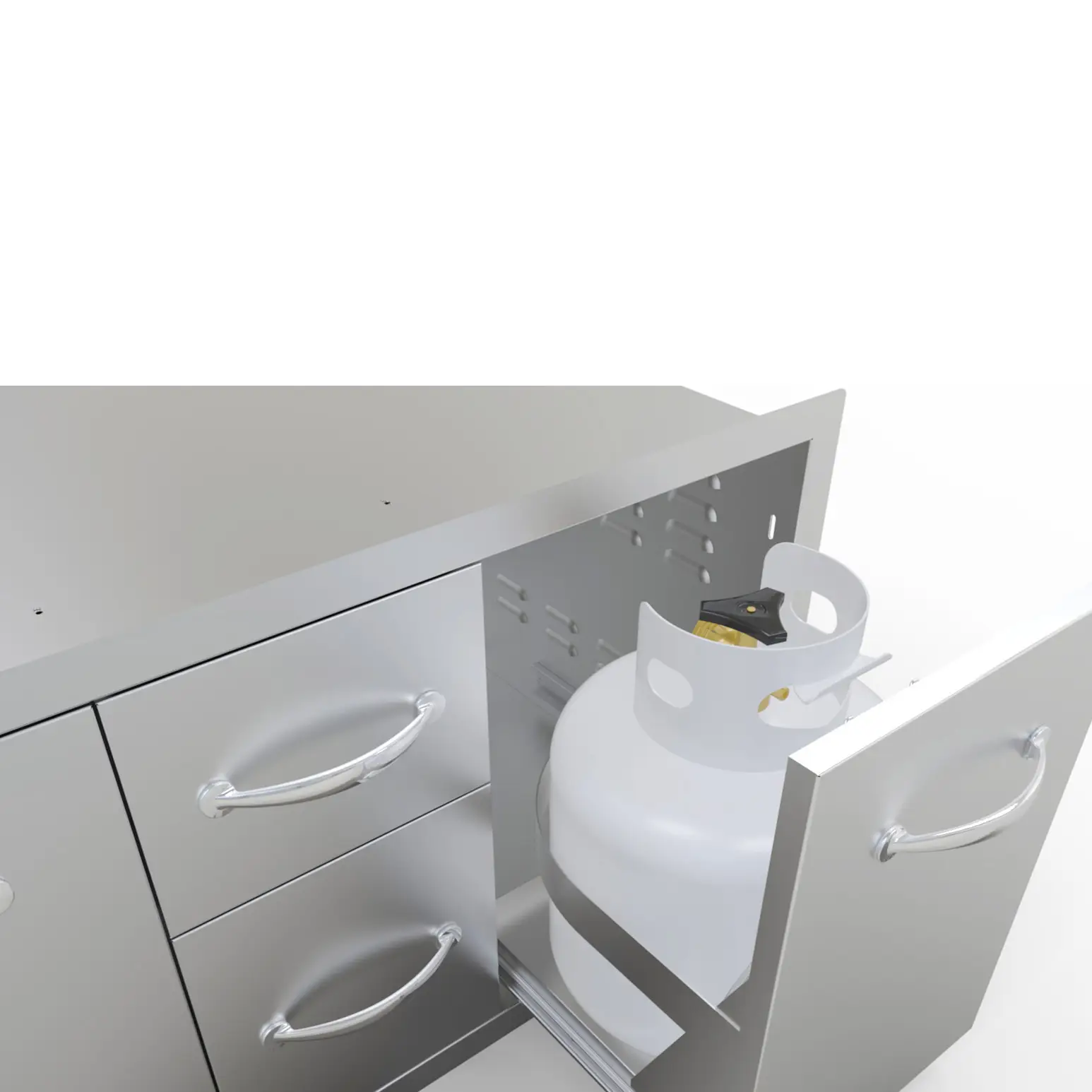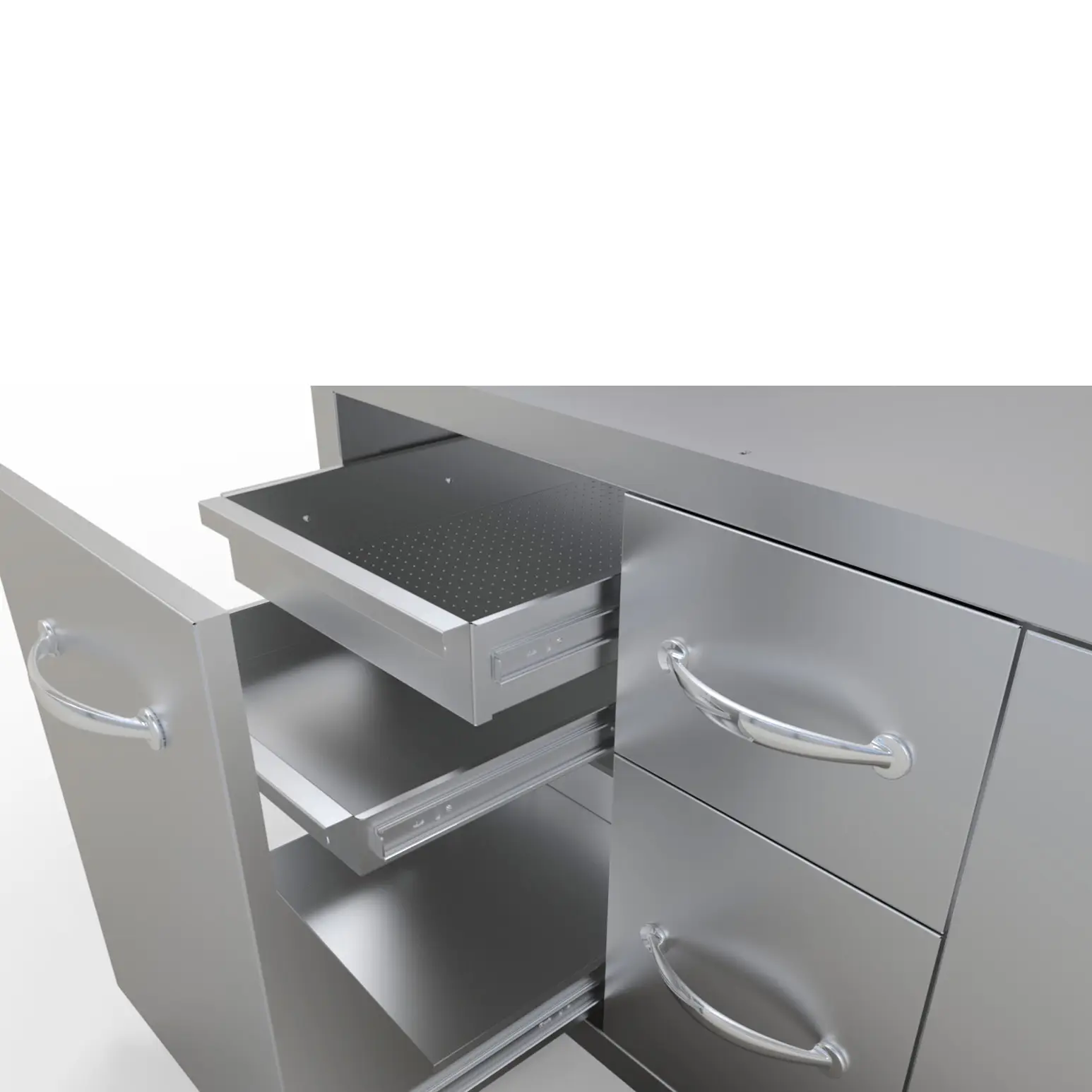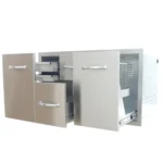 The Sunstone® 42” Multi-Storage Combo has absolutely everything needed for your outdoor kitchen, featuring one of the largest all in one solution with two spacious center drawers, on the right side well as a roll out drawer for storing a trash bin or an adjustable Trash-Bag Ring for a no-fuss Loose Trash Bag. On the Left features a Multi-Levelled Full-Height Drawer with interior stationary shelf, perfect for warming your food. All drawer tracks feature High-End Soft-Closing Tracks.